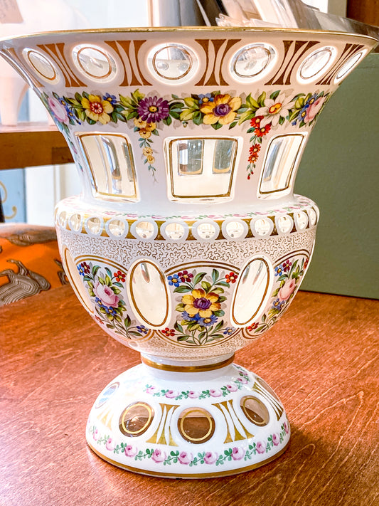 Antique White Cut-to-Clear Floral Enameled Bohemian Glass Footed Vase