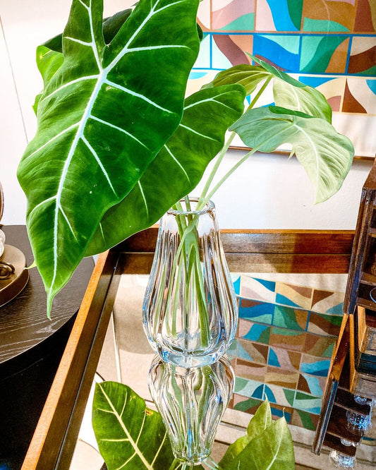 Vintage Clear Glass Etched Details Sculptural Stopper Decanter Barware