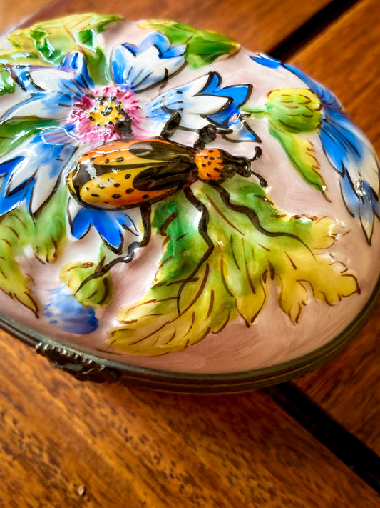Limoges France Floral Beetle Pink Glass Style Oval Porcelain Pillbox