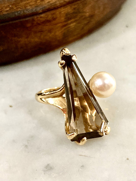 Vintage MCM 14K Yellow Gold Smokey Topaz Cultured Pearl Abstract Ring