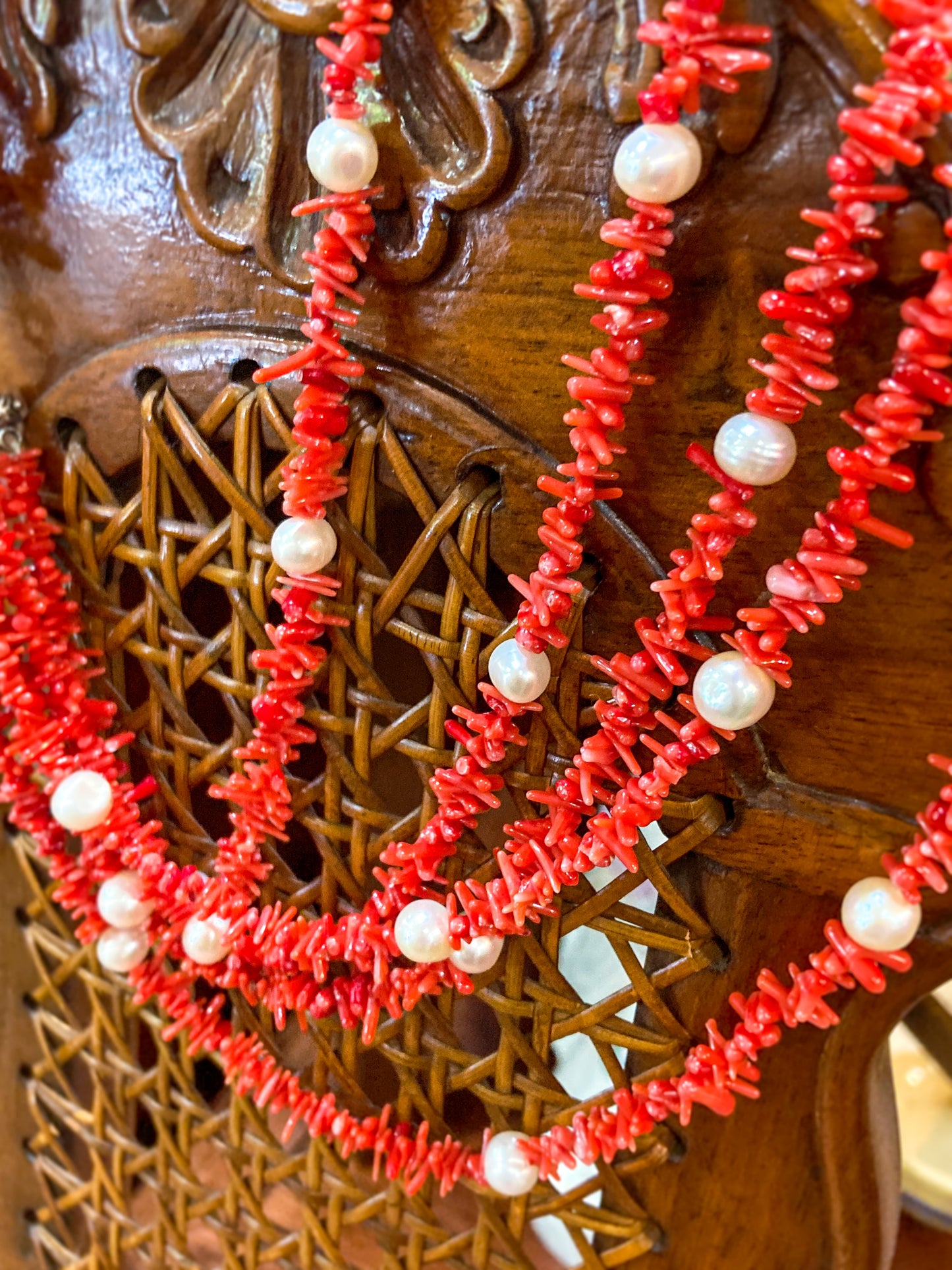 Don't forget a bold accessory for your vacation attire! This five strand coral and pearl necklace is perfect for any warm weather outfit. It offers a refreshing pop of color, ties to mother nature, and artisan craftsmanship. What more could you ask for? It is nearly begging to be a staple accessory in your wardrobe!