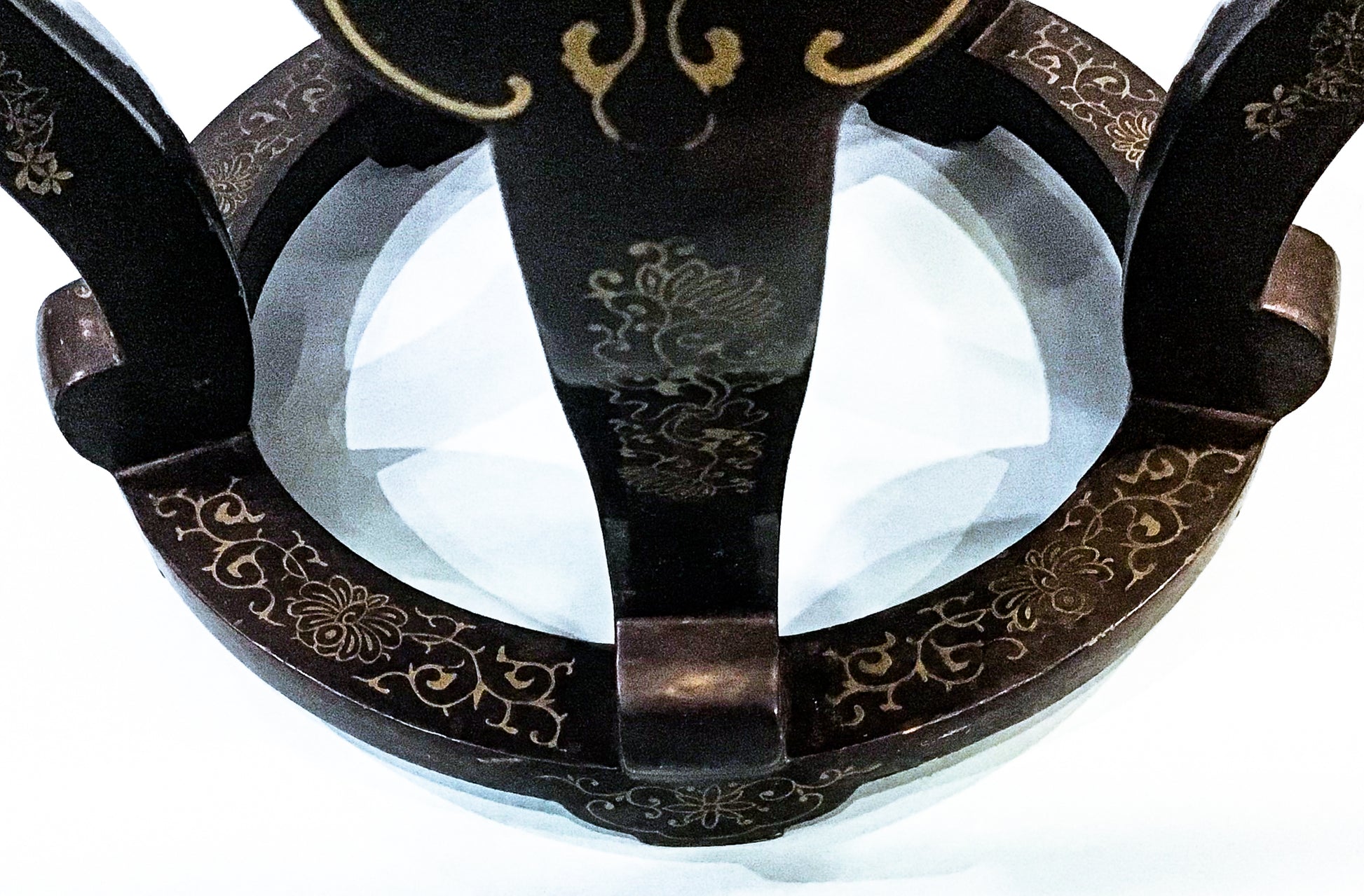 Vintage Applied Stone Roses Bird Gold Detailed Black Lacquer Round Side Table